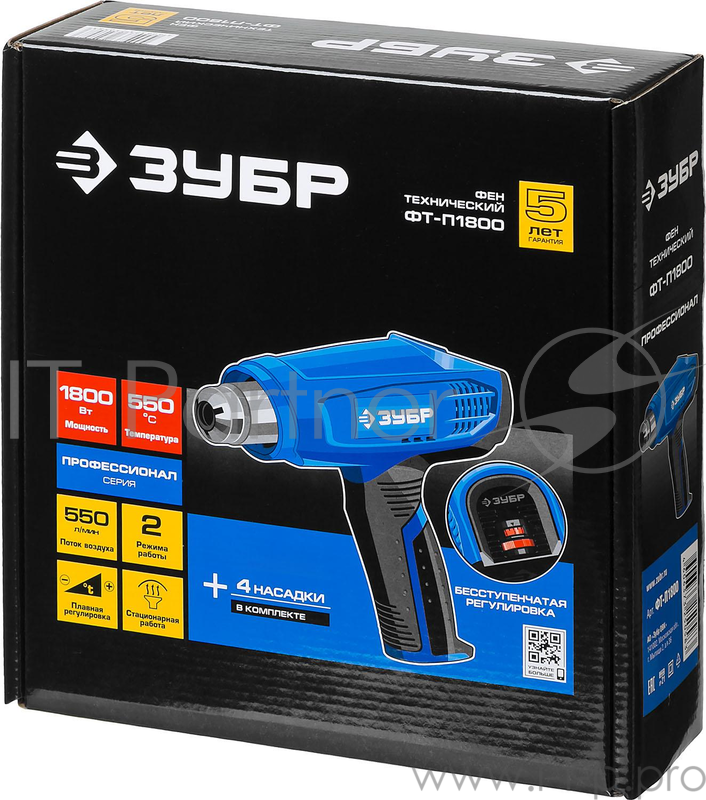 Электроинструменты ЗУБР ФТ-П1800 фен технический (строительный) { керам. изолятор, электр. регул. темп-ры, 2 режима: 80-550град, 350/550 л/мин, 1800Вт }