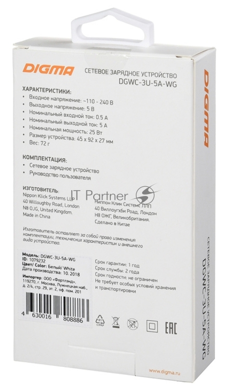 Кабели, переходники, разветвители Digma DGWC-3U-5A-WG