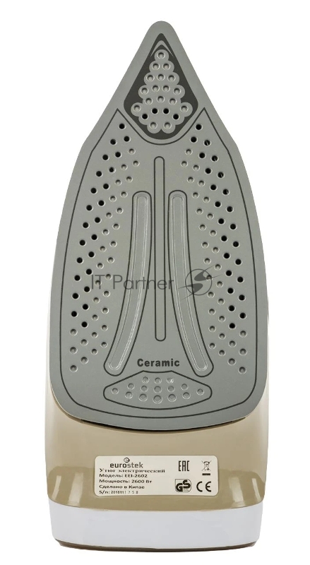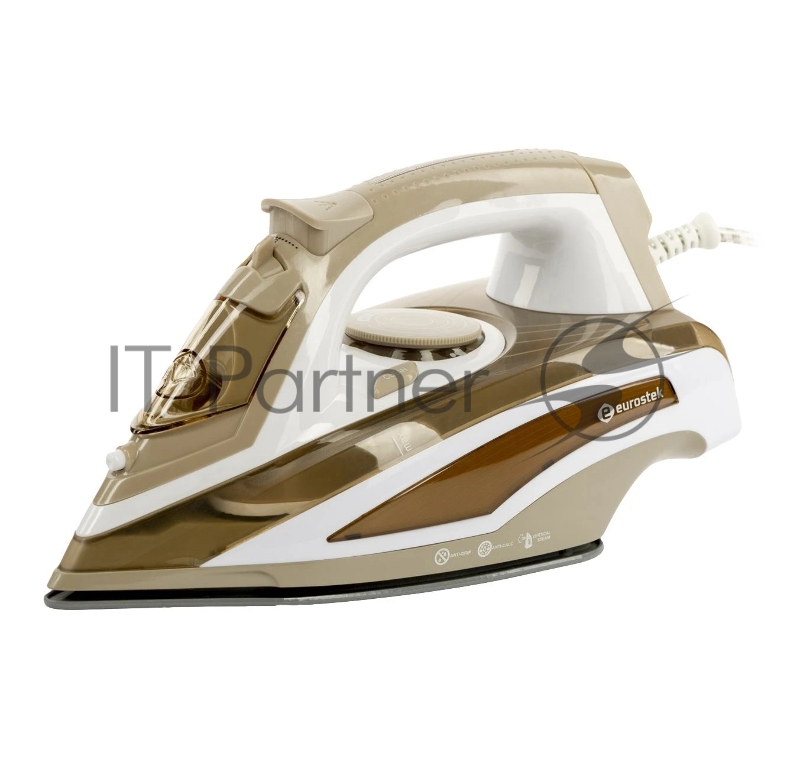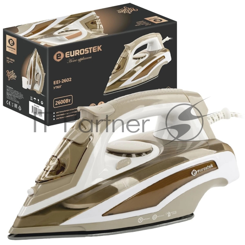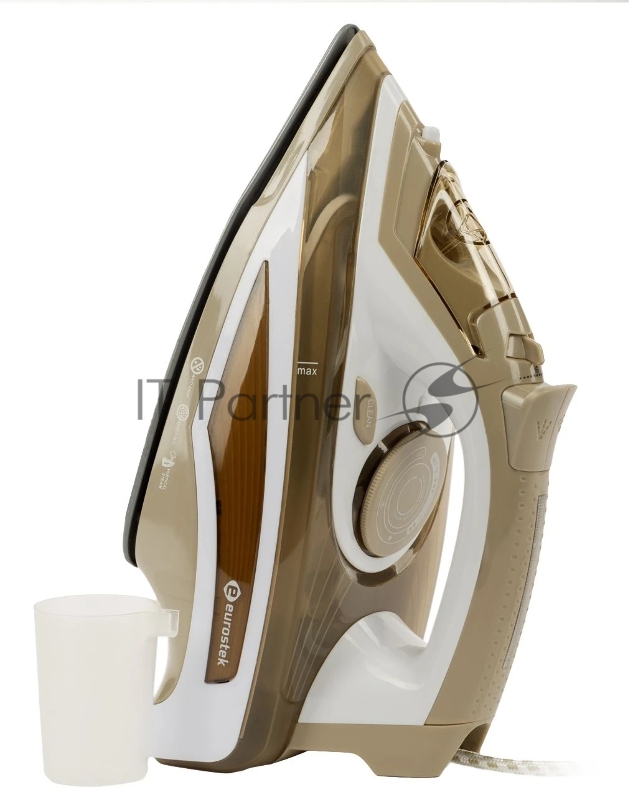 Утюг EUROSTEK EEI-2602 Мощность 2600Вт, длина подошвы: 24см, керамическая подошва, система самоочистки, противокапельная система, встроенная защита от накипи, функция разбрызгивания, вертикальное отпаривание, мерный стаканчик.