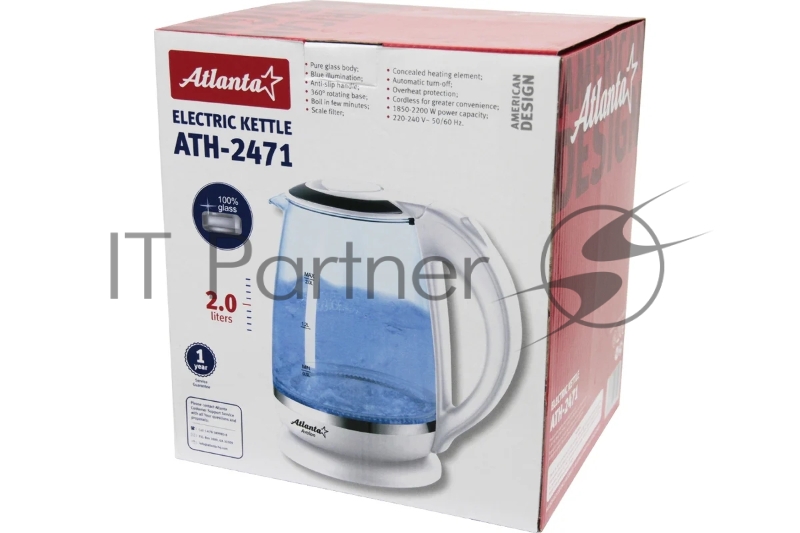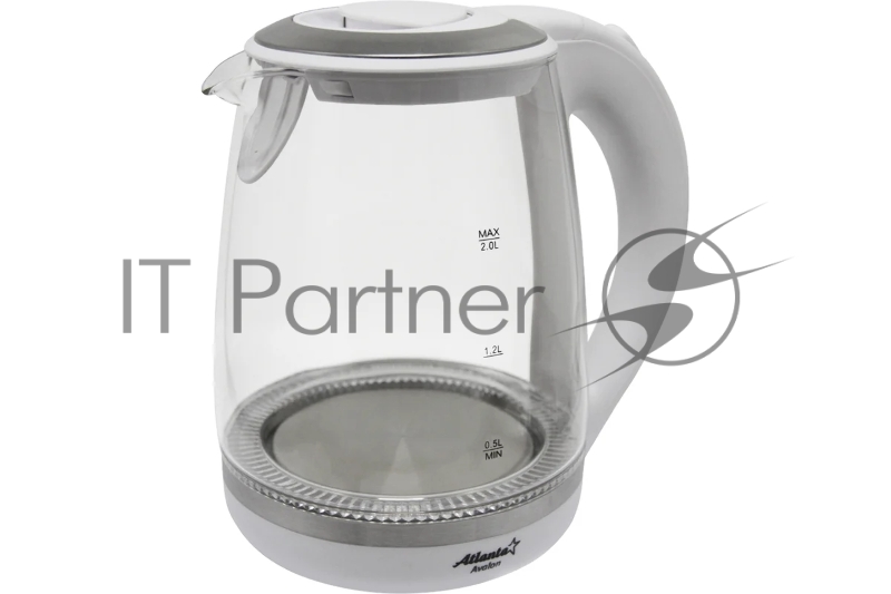 ATLANTA, ATH-2471 бел, Чайник стекло Стекло, 2л, 2200Вт, белый, температурная иллюминация, защита от перегрева без воды.