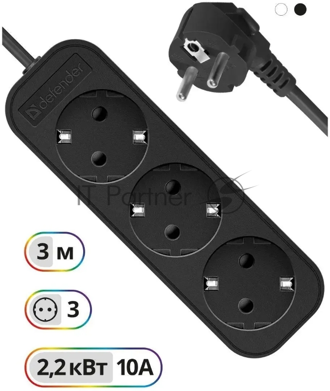 Удлинитель Defender с заземлением M330 3.0 м, 3 розетки, черный