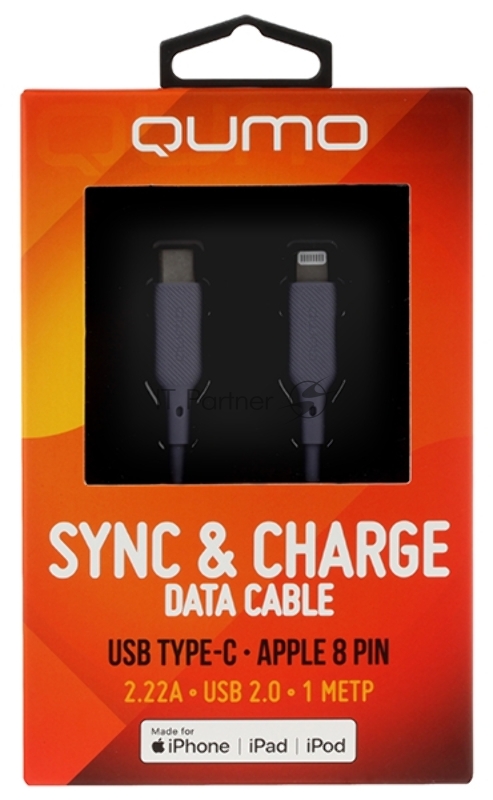 Кабель QUMO, MFI С94, Type-C на MFI Apple 8 pin, силиконовый, 1м, 2,22A, 9V, 20W, PD (серый)