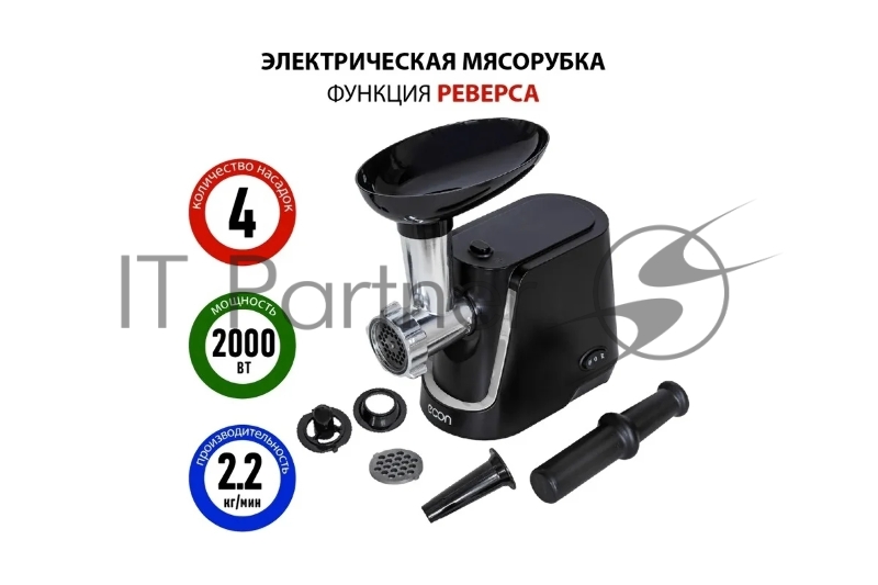 Мясорубка Econ ECO-1060MG, Макс. мощность 2000 Вт, Производительность 2,2 Кг/мин, Функция - реверс. Пластиковый лоток, 1 скорость, Нож из высококачественной стали, Защита от перегрузки двигателя, В комплекте 2 решетки 7/5 мм, Насадки для приготовлени