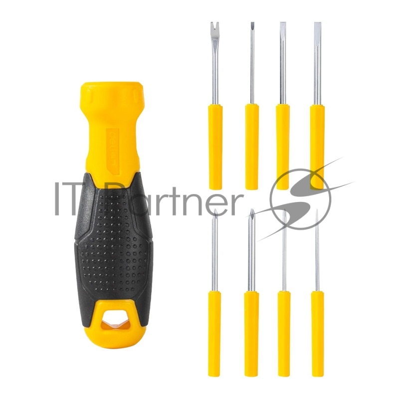Многофункциональная отвертка 8-в-1 Deli DL636009 1шт ручка, 3 бита Phillips: PH0, PH1, PH2, 3 насадки с прорезями: 3 мм, 5 мм, 6 мм,2 специальные биты: точечные, Y-образные. Материал хвостовика: Cr-V.