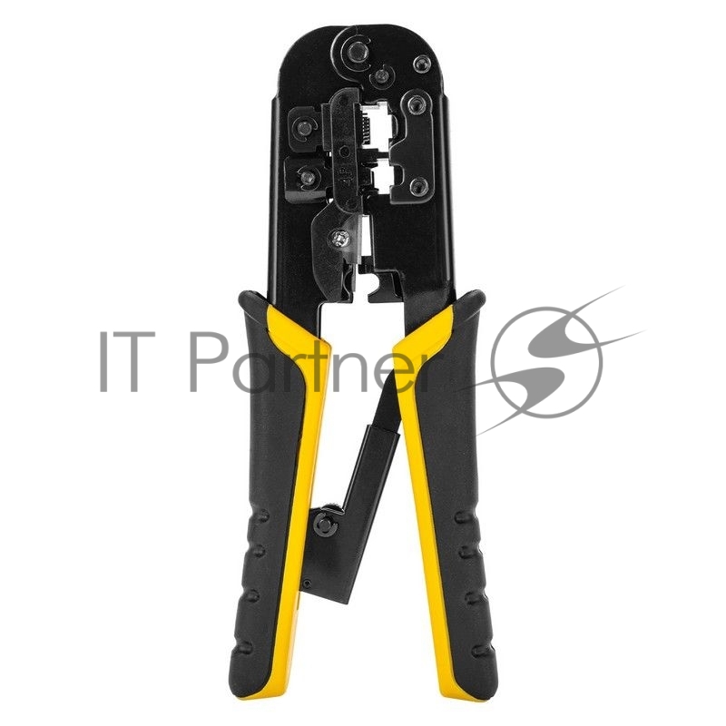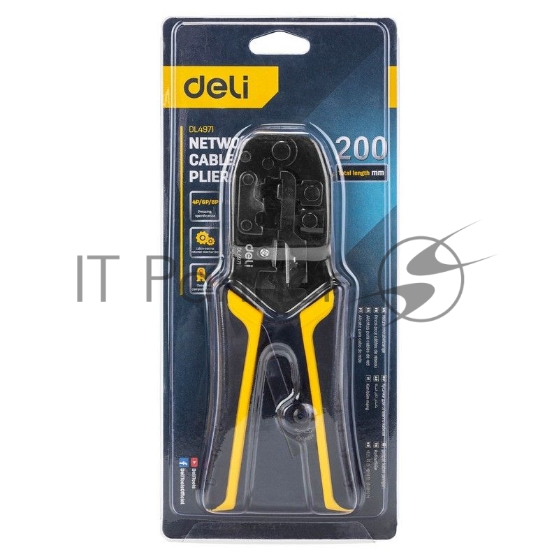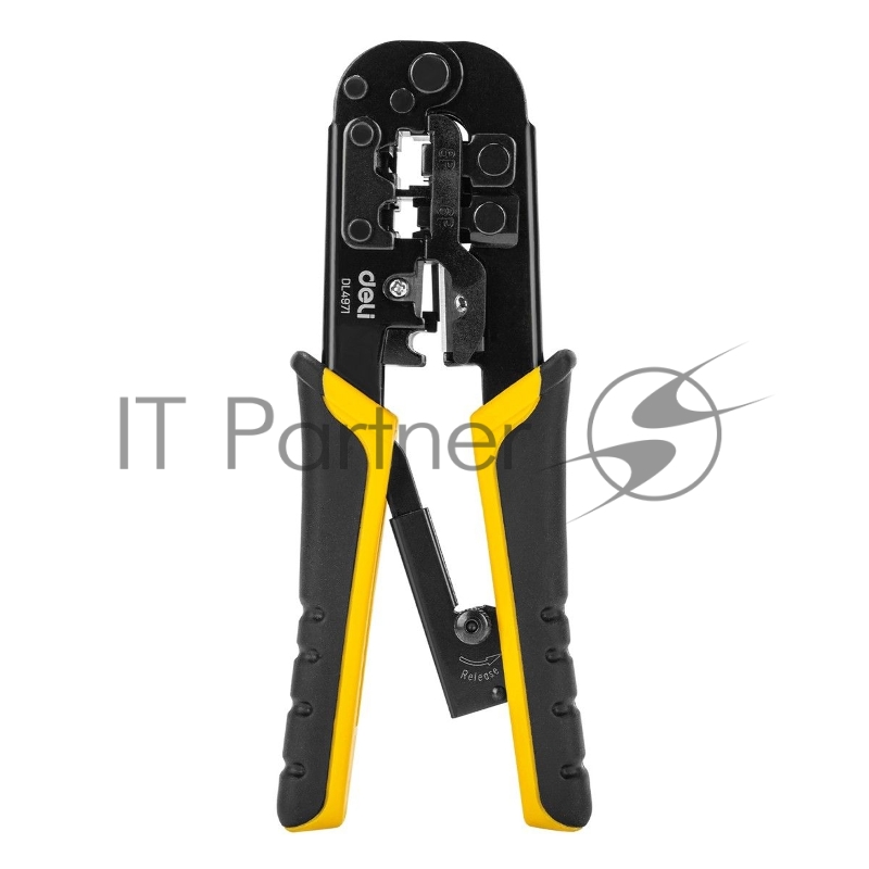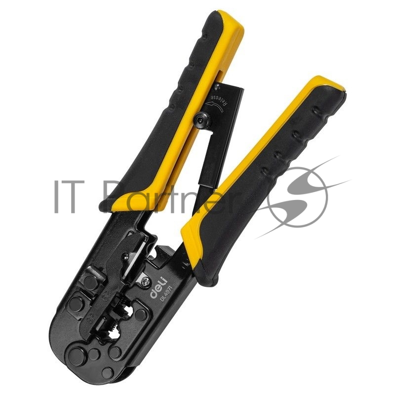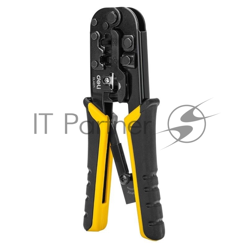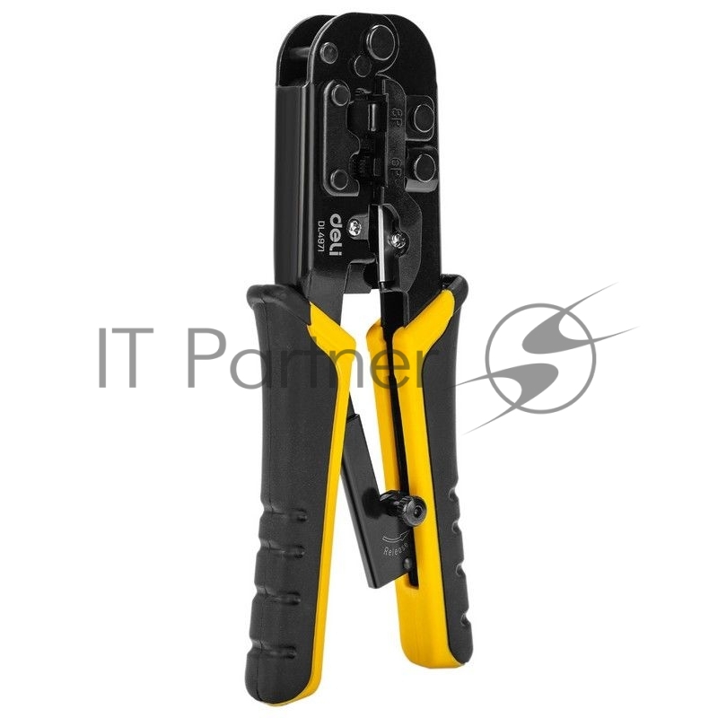 Обжимные клещи Deli DL4971 4P,6P,8P Размер: 200 мм. Спецификация обжима: 4P, 6P, 8P. Сталь A3 с черным покрытием. Ручка из ПВХ и ТПР. Храповой механизм. Подходит для витой пары UTP/STP и телефонных кабелей.