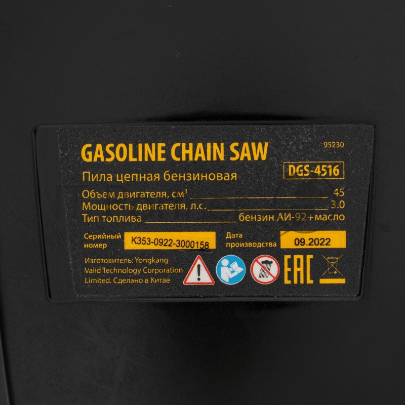 Пила цепная бензиновая DGS-4516, шина 40 см, 45см3, 3,0 л.с., шаг 3/8, паз 1,3 мм, 57 зв// Denzel