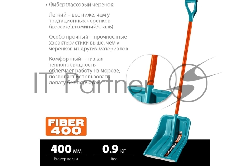 Снеговая лопата GRINDA PROLine FIBER-400 400 мм пластиковая с алюминиевой планкой, особопрочный легкий черенок из фибергласса, V-ручка