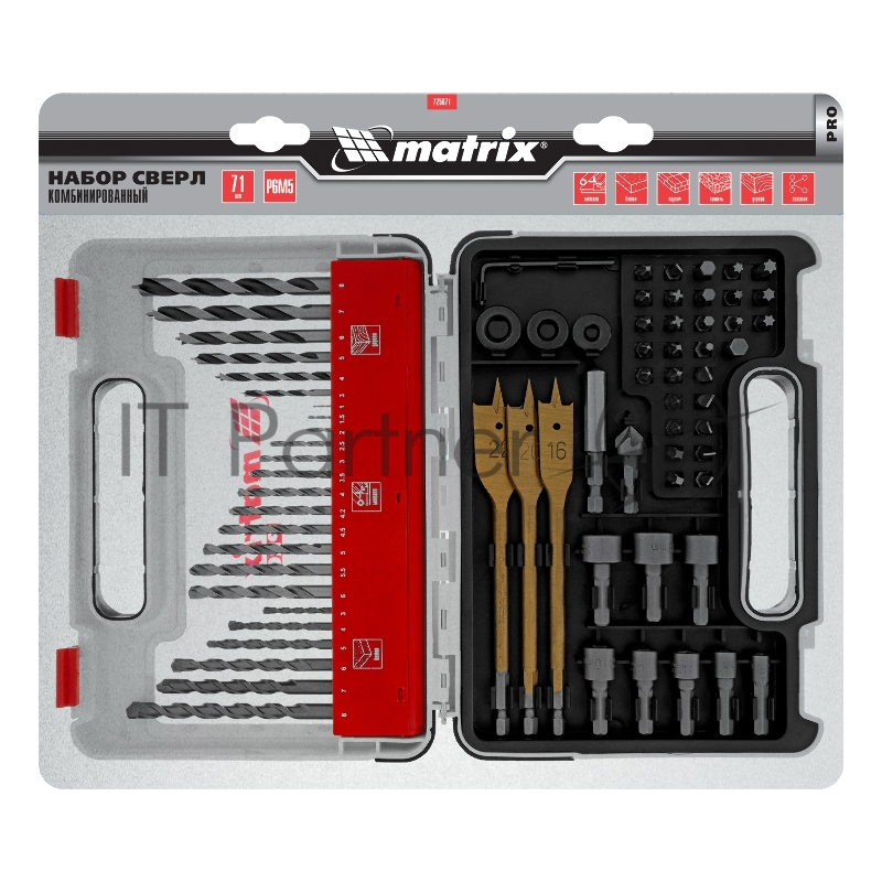 Набор сверл комб.,мет.1-6мм,бет.3-8мм,дер. перки,бит.30шт,адап.,голов.8шт PRO// Matrix