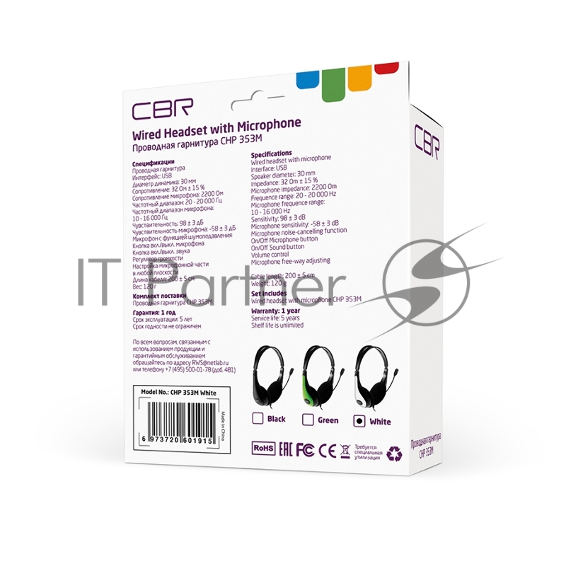 [Наушники] CBR CHP 353M White, Компьютерная гарнитура проводная стерео, микрофон с шумоподавл., накл. наушники, USB, кнопка выкл. микрофона, регул. громк., регул. оголовья, длина каб. 2 м, цвет чёрный-белый