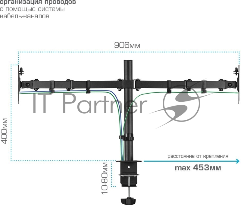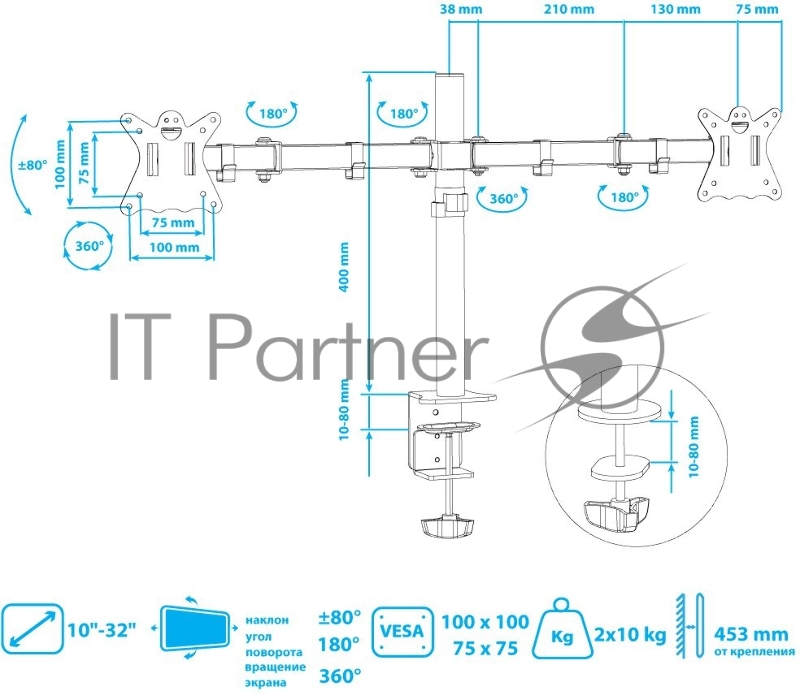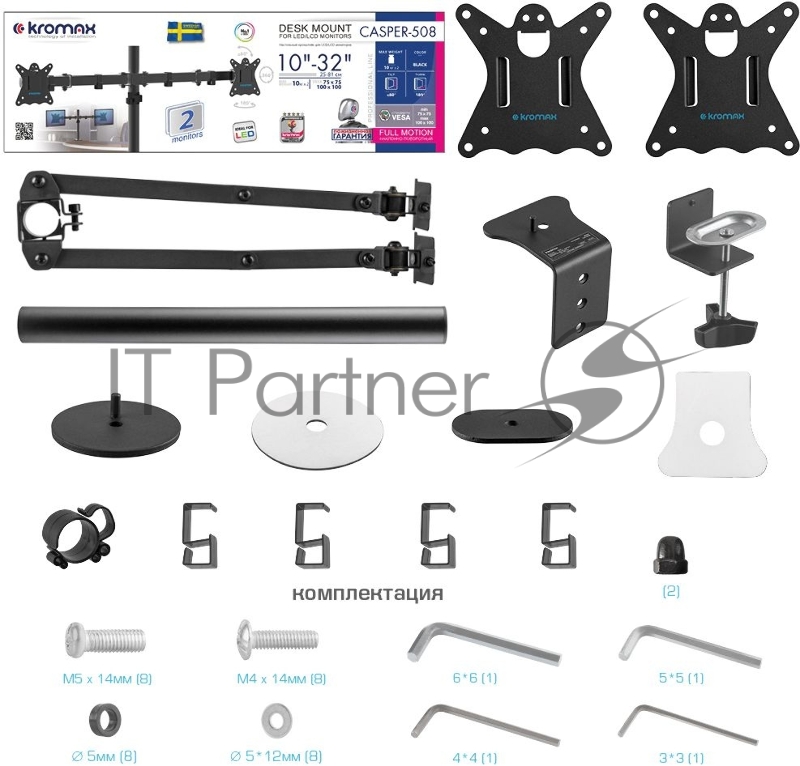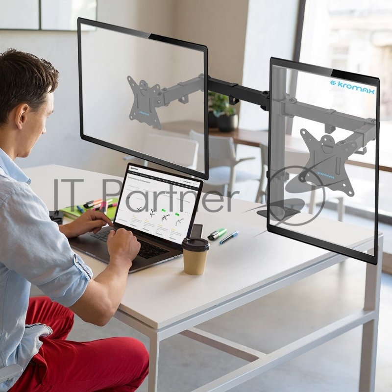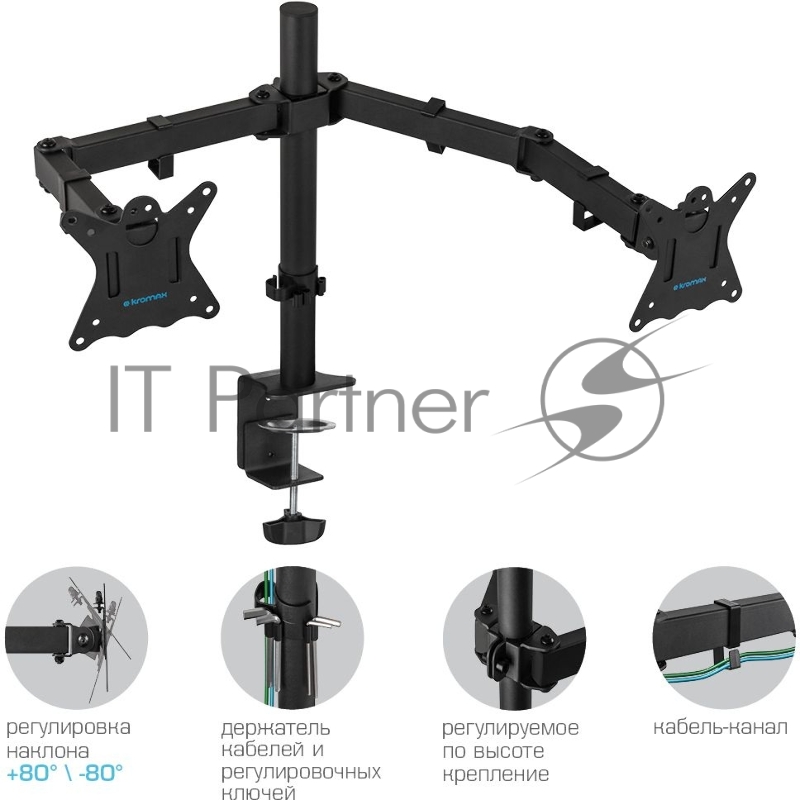 Кронштейн для монитора Kromax CASPER-508 black 4 шт/уп. 10-32, max 2x10 кг, 6 ст св., нак. ±80°, пов. 360°, max VESA 100x100 мм.