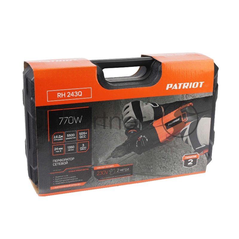 Перфоратор PATRIOT RH 243Q, SDS+, мощность 770 Вт, 2.6 Дж, 3 режима работы, быстросменный патрон QCC, макс.диаметр 24мм, глубиномер, кейс