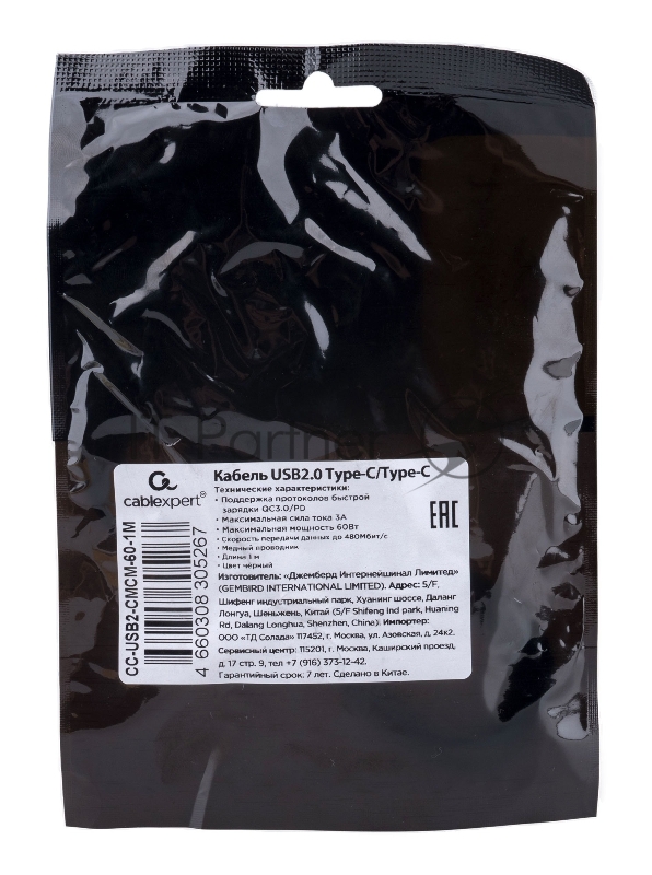 Кабель USB2.0 Cablexpert CC-USB2-CMCM-60-1M, Type-C/Type-C, 3A, 60Вт, PD/QC3.0, медь, 1м, черный, пакет