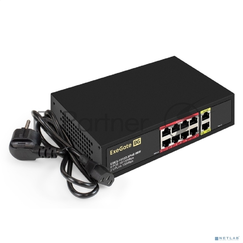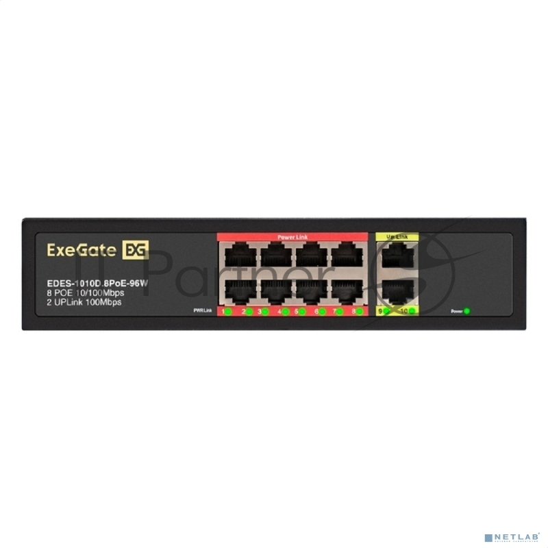 Коммутатор неуправляемый ExeGate EDES-1010D.8PoE-96W (10-портовый UTP 10/100 Base-Tx: 8 портов IEEE 802.3af (PoE), мощность PoE: 25W, суммарно 96W, 2 порта RJ45 uplink, настенный/настольный, металлический корпус)