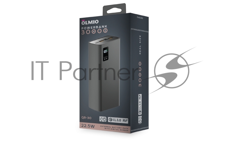 Внешний аккумулятор OLMIO QR-30, 30000mAh, 22.5W, QuickCharge3.0/PowerDelivery, LCD, серый.