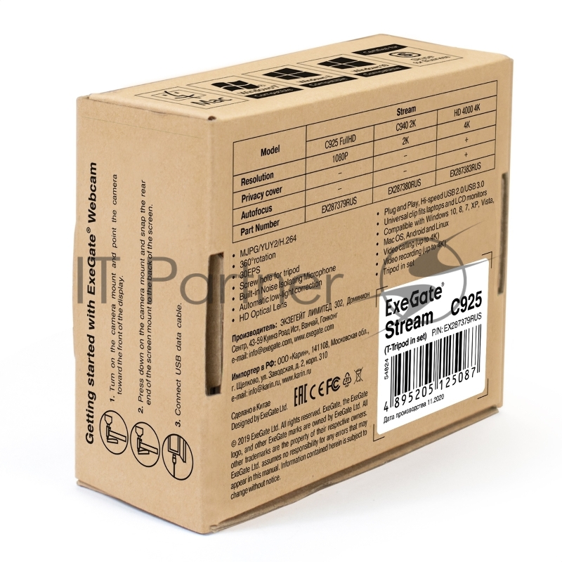 Веб-камера ExeGate Stream C925 Full HD (2Мп, 1920х1080, 1080P, 30fps, поддержка H.264, фиксированный фокус, 4-линзовый объектив, микрофон с шумоподавлением, универсальное крепление, USB, кабель 1,5 м, Windows® 7/8/10/11, Mac OS 10.6 и выше, Chrome OS