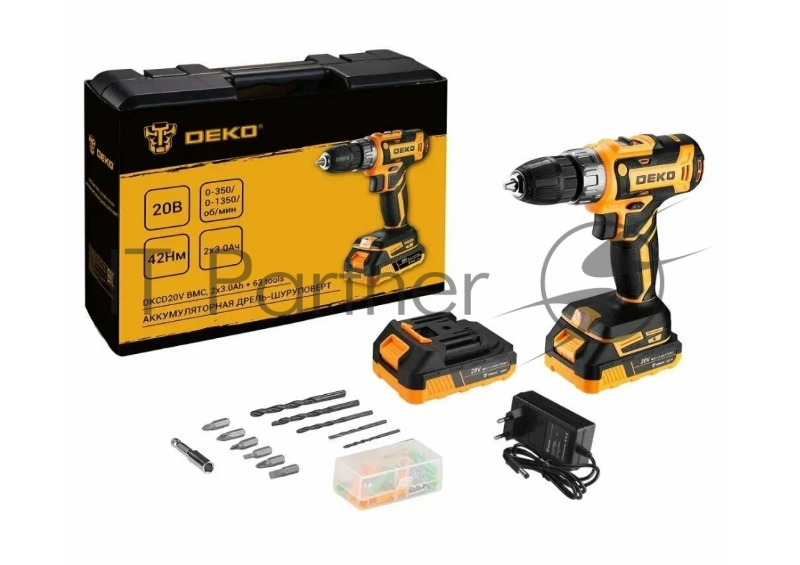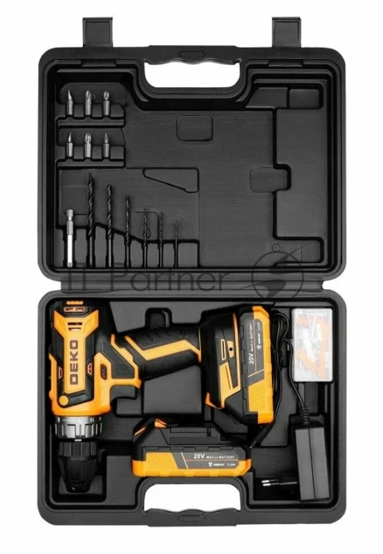 Аккумуляторная дрель-шуруповерт DEKO DKCD20V в кейсе + набор 63 инструмента для дома, 20В, 2х3.0Ач 080-1009