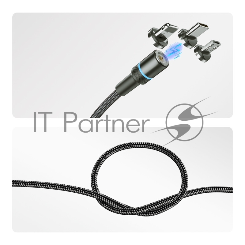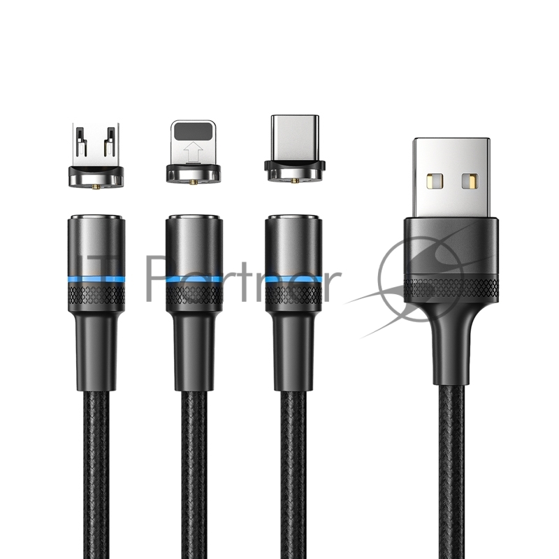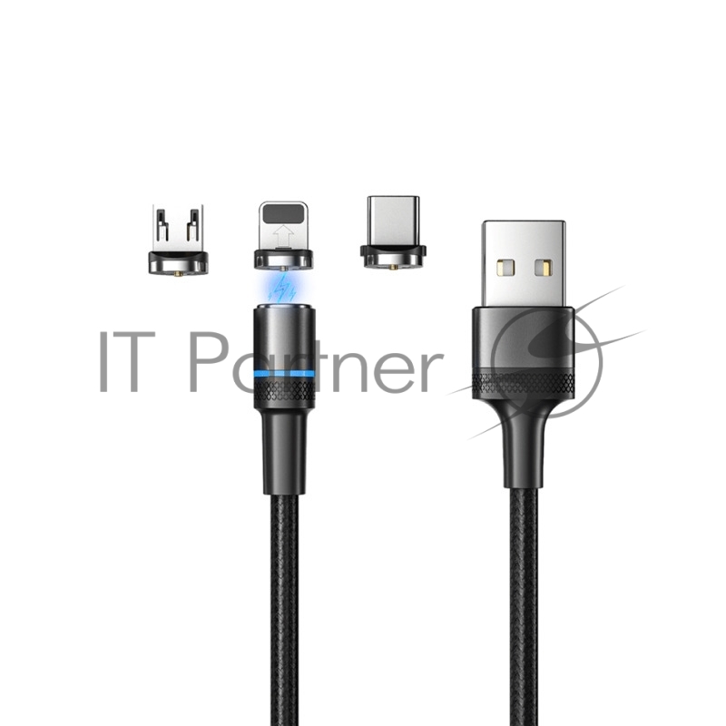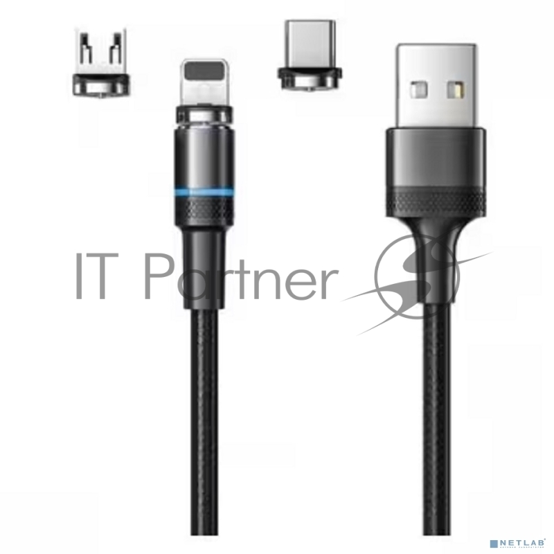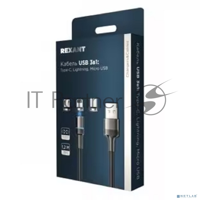 Кабель USB Rexant 3в1 со съемными магнитными портами, Type-С (2A), Lightning (2,4A), Micro USB (2A), 1,2м, в черной оплетке, с LED подсветкой