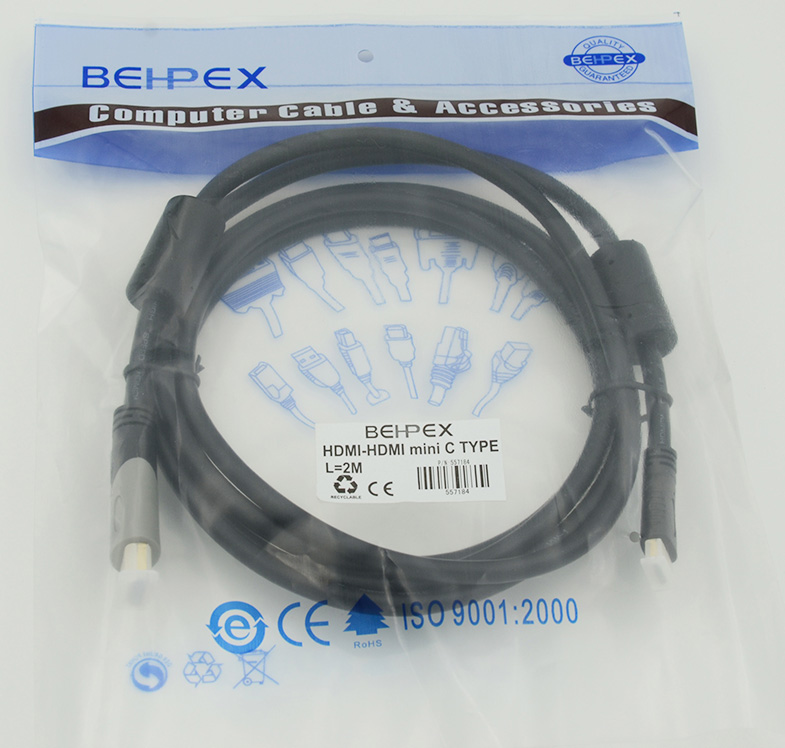 Описание: Mini-HDMI кабель для подключений ноутбуков, ультрабуков и планшетов к мониторам, телевизорам и проектора. Ферритовые кольца улучшают качество передачи данных. Длина кабеля 2 метра.