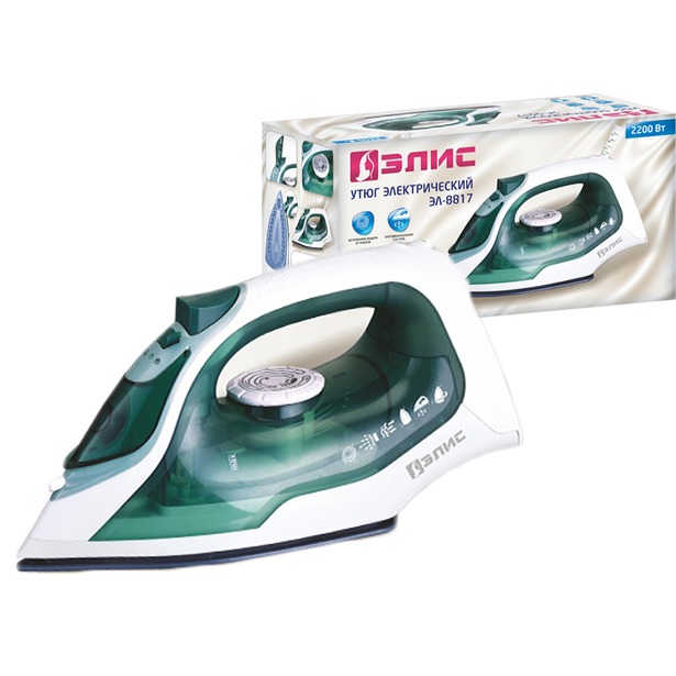 Утюг электрический ЭЛИС ЭЛ-8817 (10) (мощность 2200В, керамическая подошва, система самоочистки, встроенная защита от накипи, функция разбрызгивания, вертикальное отпаривание, мерный стаканчик)