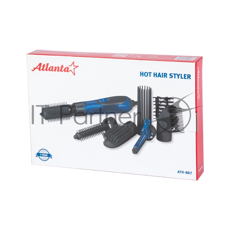Фен-щетка ATLANTA, ATH-887 голуб, 500Вт, 2 скорости, вращение-фиксация насадки, защита от перегрева, 7 насадок.