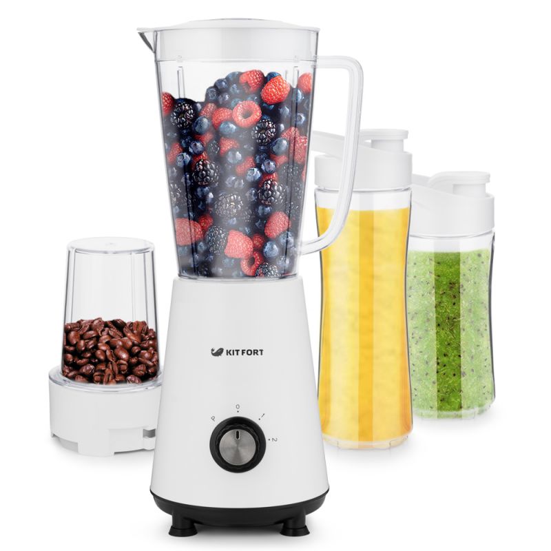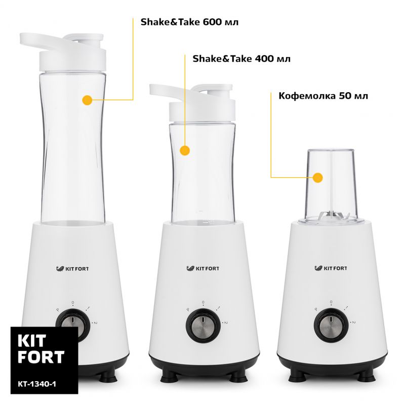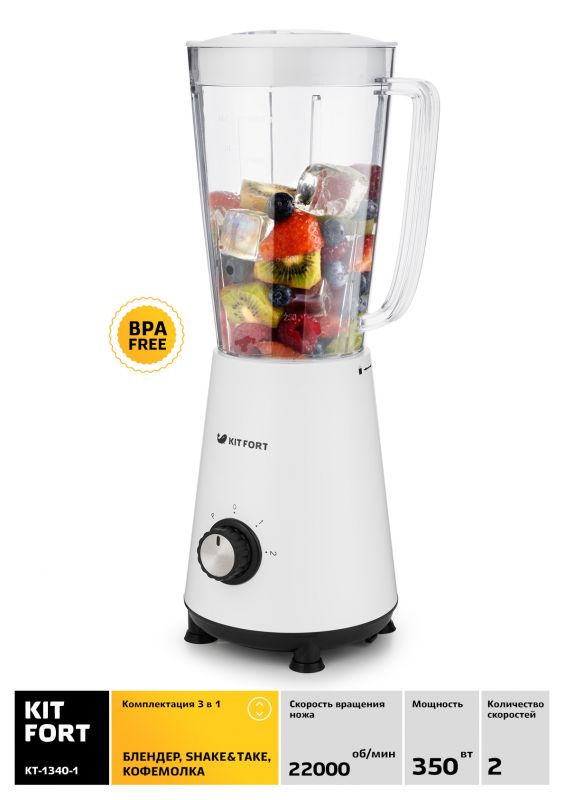 Особенности: Блендер Kitfort КТ-1340 сочетает в себе функции трех устройств. Это стационарный блендер с функцией Shake & Take (шейк энд тэйк) и портативными бутылками, а также кофемолка.