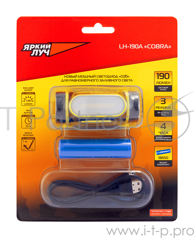 Фонарь ЯРКИЙ ЛУЧ LH-190A Cobra налобный св/диод cob 3режима 190/60/10лм li-ion 2200мАч