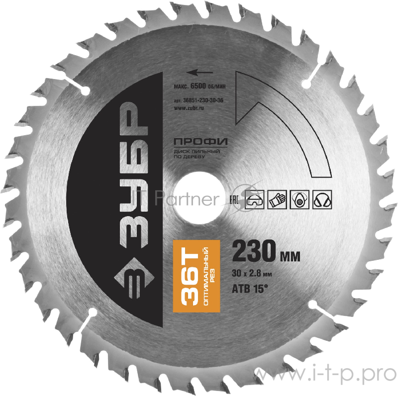Круг пильный твердосплавный ЗУБР 36851-230-30-36 ПРОФИ оптимальный рез по дереву 36T 230х30мм