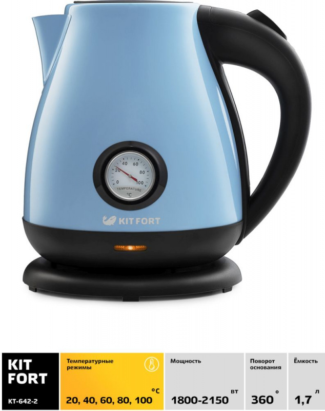 Чайник электрический Kitfort КТ-642-2 1.7л. 2200Вт голубой/черный (корпус: нержавеющая сталь)