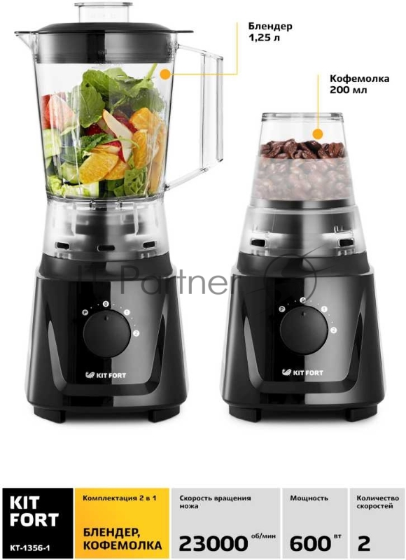 [Блендер] KITFORT КТ-1356-1 Блендер «2 в 1» Мощность: 600 Вт.Длина шнура: 0,94 м.чёрный