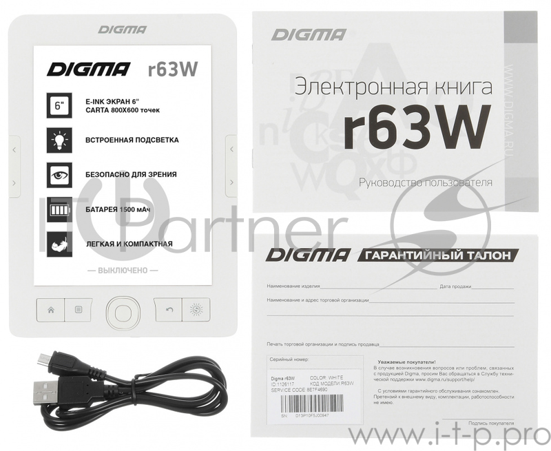 Электронная книга Digma R63W 6 E-Ink Carta 800x600 600MHz/4Gb/microSDHC/frontlight белый