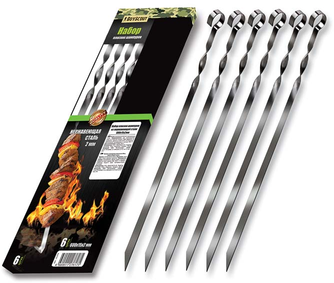Набор плоских шампуров BOYSCOUT 61370 из нержавеющей стали, 600x15x2 мм, 6 шт в ПВХ коробке / 12