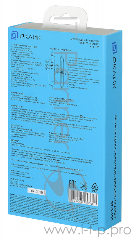 Гарнитура вкладыши Oklick BT-S-155 черный беспроводные bluetooth (в ушной раковине)