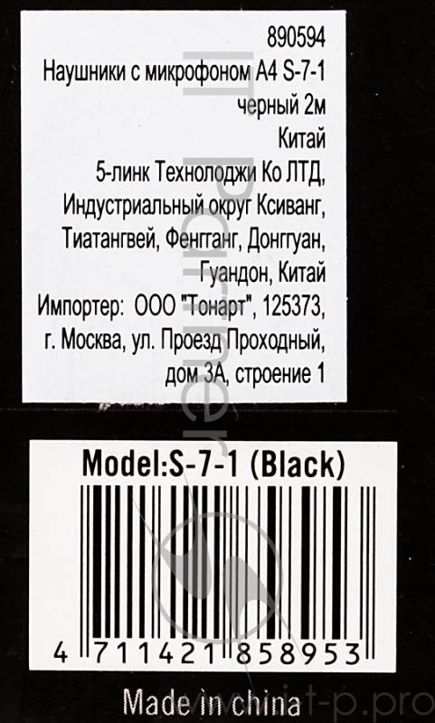 Наушники с микрофоном A4 S-7-1 черный 2м вкладыши в ушной раковине