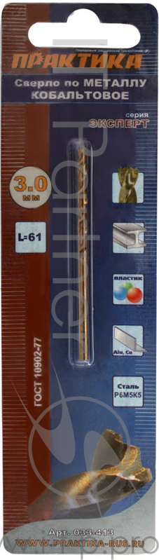 Сверло по металлу ПРАКТИКА 033-413 3.0х61мм кобальтовое, в блистере