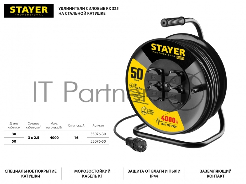 Удлинитель силовой Stayer 55076-50 3x2.5кв.мм 4розет. 50м КГ катушка черный