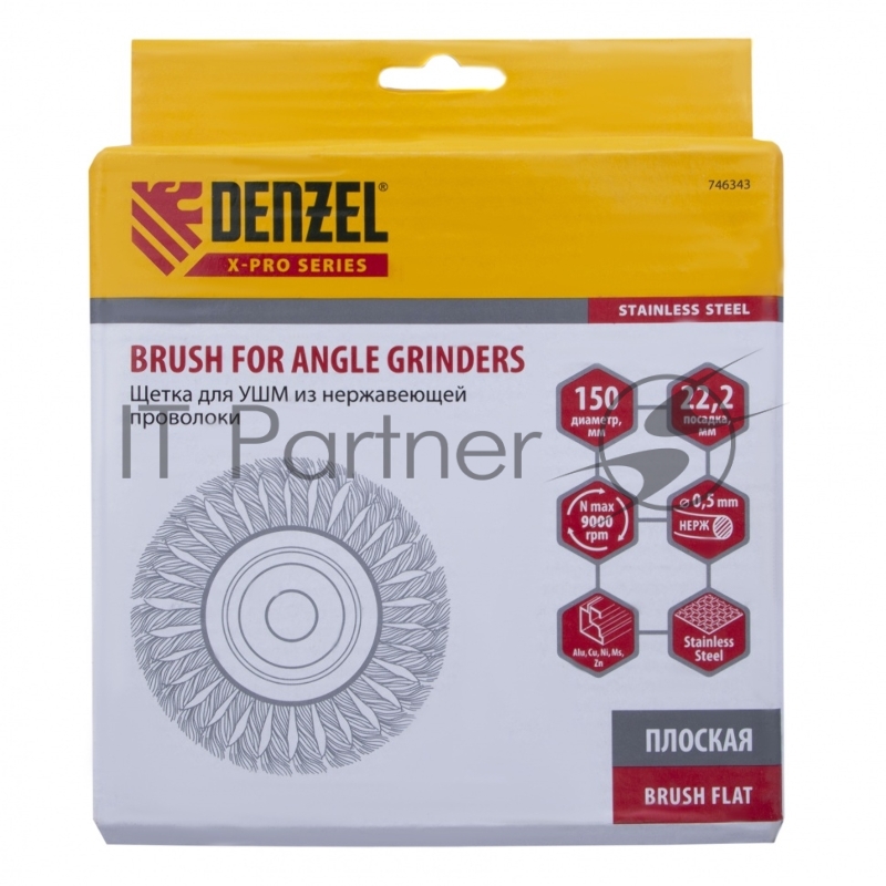 Щетка для УШМ DENZEL 150 мм, Плоская , крученая нержавеющая проволока 0,5мм 746343