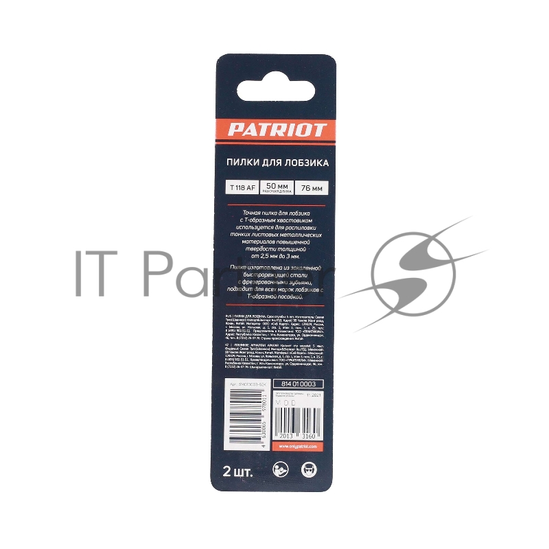 Пилка для лобзика EDGE by PATRIOT T118AF по металлу, 2шт в блистере