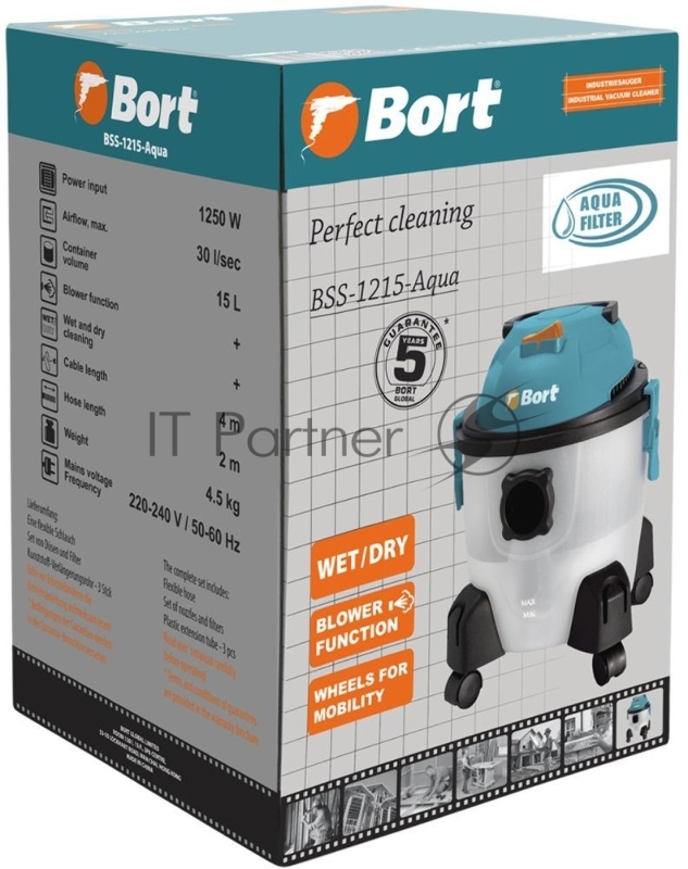 Строительный пылесос Bort BSS-1215-Aqua 1250Вт (уборка: сухая/влажная) серый