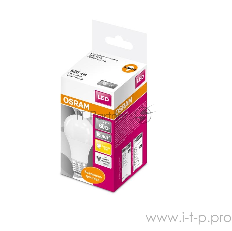 Лампа светодиодная LED STAR CLASSIC A 60 7W/827 7Вт грушевидная 2700К тепл. бел. E27 600лм 220-240В матов. пласт. OSRAM 4058075096387