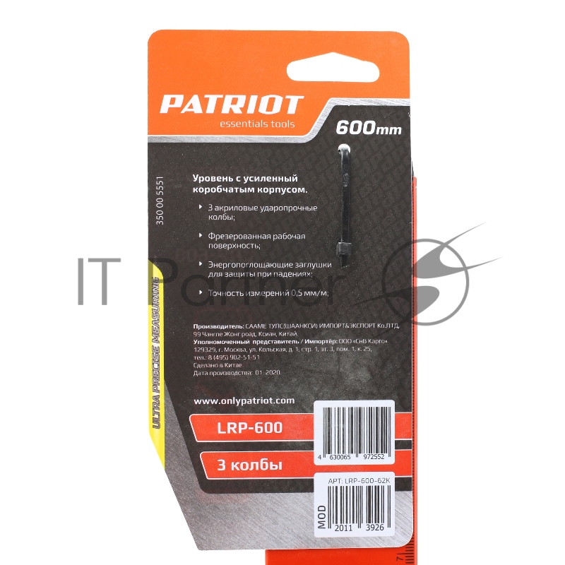 Уровень PATRIOT LRP-600, магнитный, алюминиевый фрезерованный, усиленный, 600мм