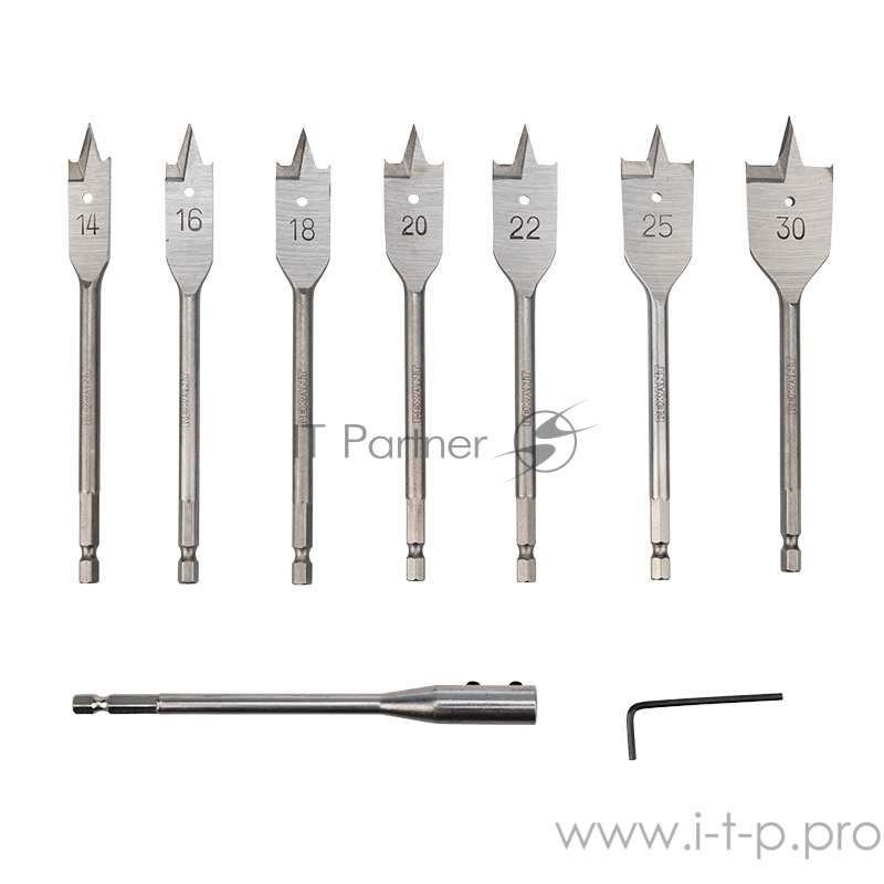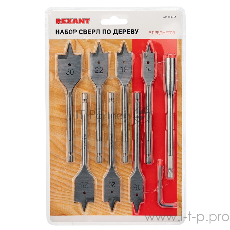 Набор сверл перовых по дереву 9 предметов: 14-16-18-20-22-25-30х152 мм, удлинитель, ключ угловой REXANT