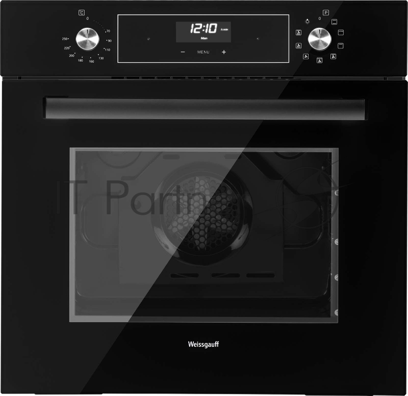 Встраиваемые электрические духовки 60 см Weissgauff 59.5х59.5x61 см, 64л, 9 режимов, утапливаемые переключатели, дисплей, электронное управление с сенсорными кнопками, гриль, конвекция, телескопы на 1-м уровне, черное стекло