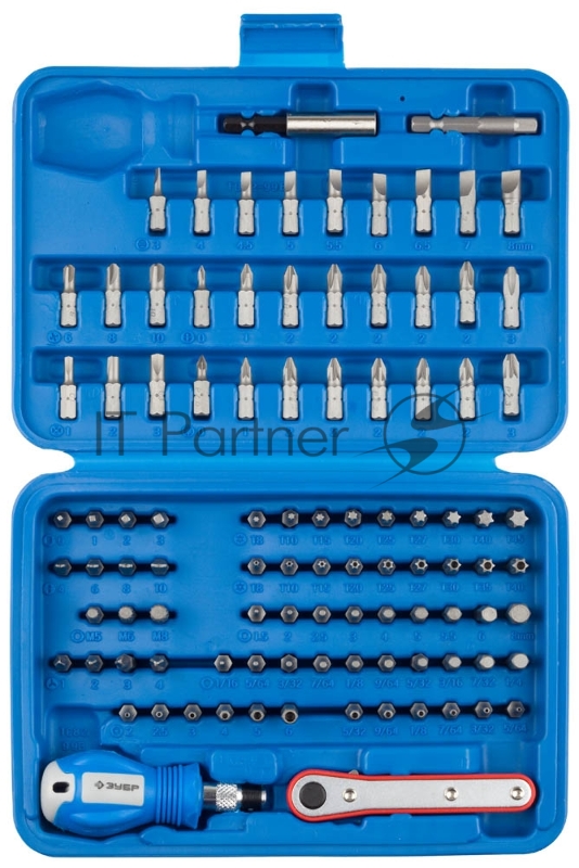 Набор ЗУБР Биты ЭКСПЕРТ УНИВЕРСАЛ, с мини-трещоткой и отверткой битодержателем, Cr-Mo, 99 предметов, в боксе.