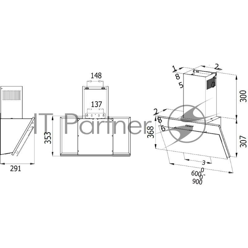 Наклонная вытяжка, 60 см, механический контроль, 3 скорости работы, производительность 900 м3/ч, LED освещение, черный, металл, стекло, 600 x 291х368-607 мм.