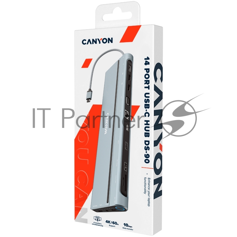 Хаб Canyon 14 in 1 hub, with Type C female *2,Type C male *1:max 10Gbps,USBA*3:max 10Gbps,DP*1,VGA*1,SD card slot*1,TF card slot*1,Audio 3.5 audio*1,HDMI*2,RJ45*1,cable length 0.20m,Aluminum alloy housing,76*22.5*301mm,Dark grey