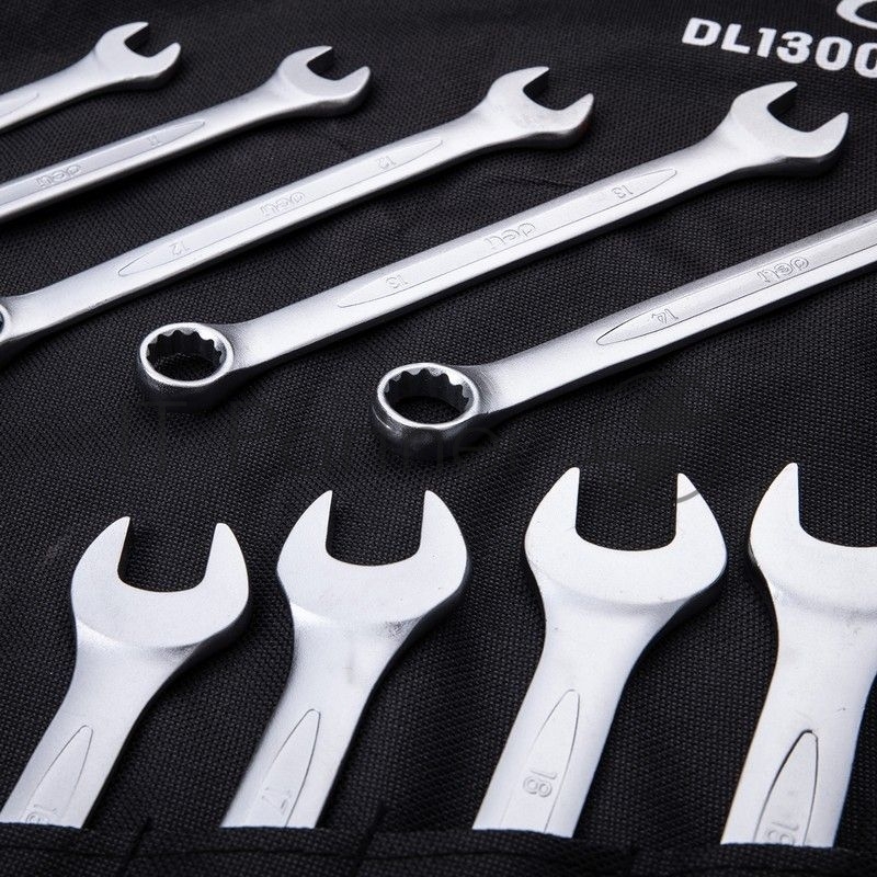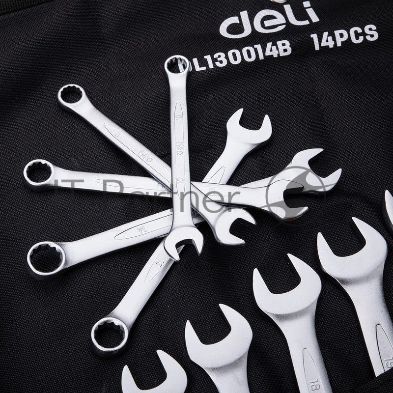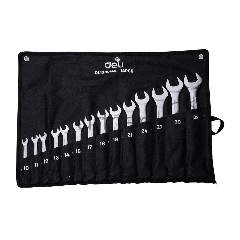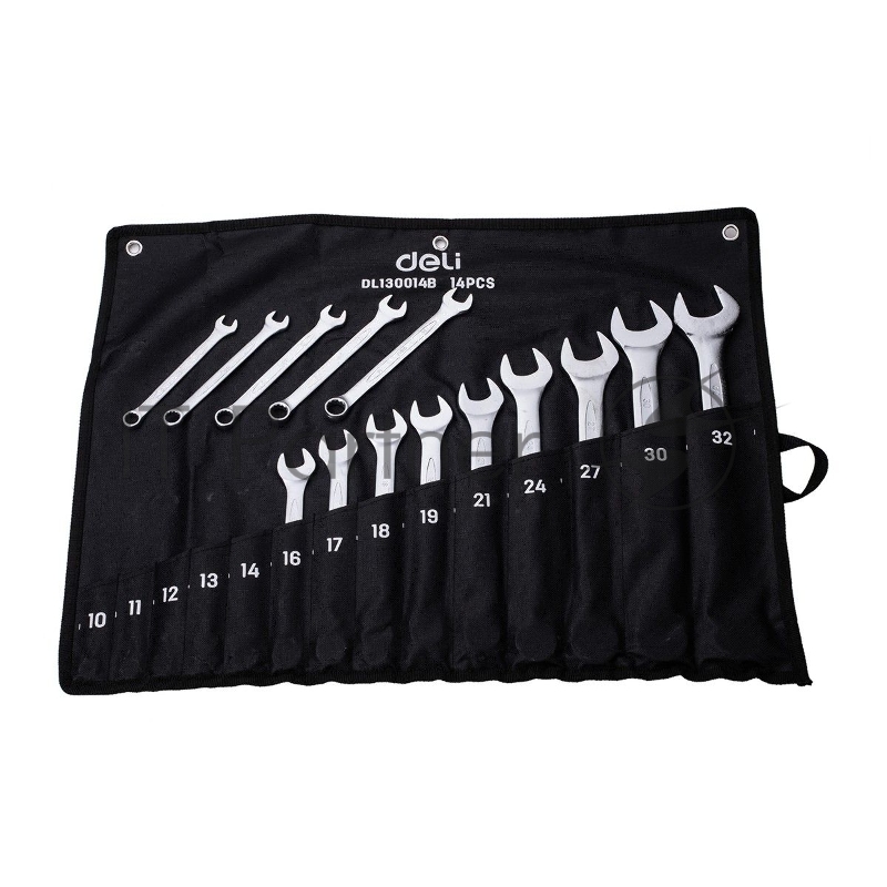 Набор комбинированных гаечных ключей 14 шт Deli DL130014B Спецификация: 10 мм, 11 мм, 12 мм, 13 мм, 14 мм, 16 мм, 17 мм, 18 мм, 19 мм, 21 мм, 24 мм, 27 мм, 30 мм, 32 мм. Матовая хромированная поверхность. Тканевая упаковка.