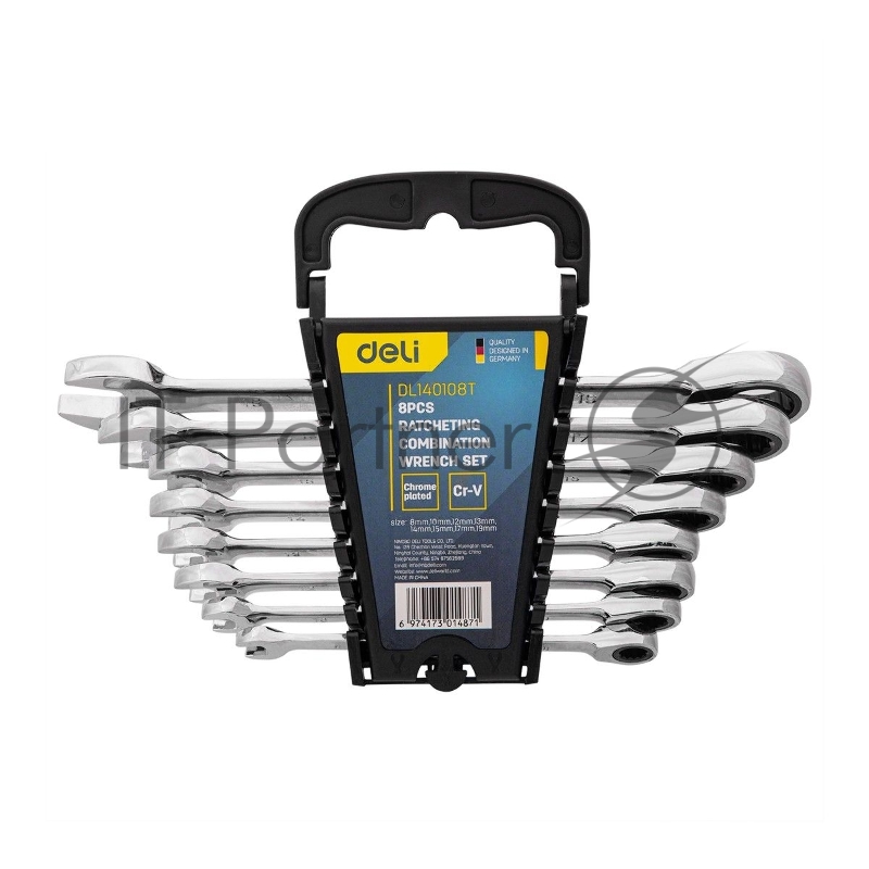 Набор комбинированных ключей с трещоткой 8 шт Deli DL140108T Спецификация: 8,10,12,13,14,15,17,19мм. Сталь 40 Cr. Трещётка 50BV30 72Т.