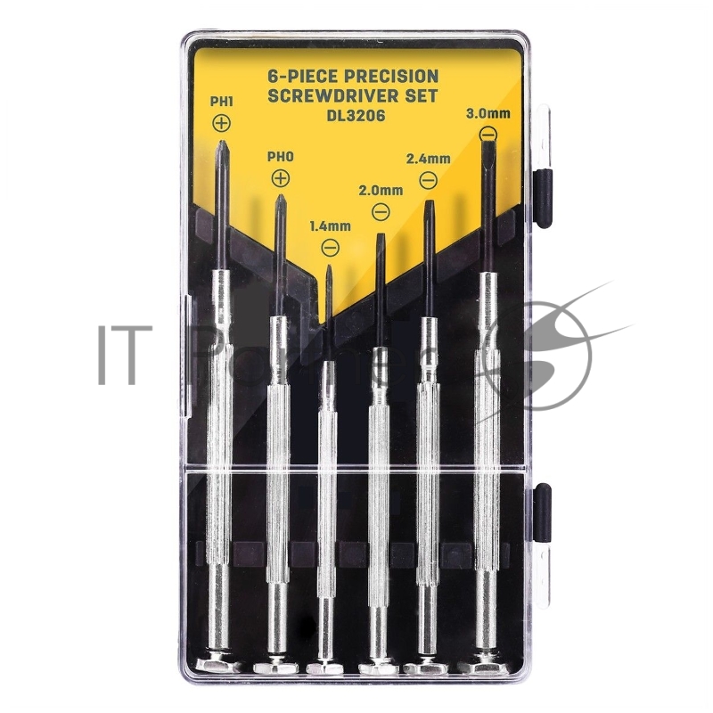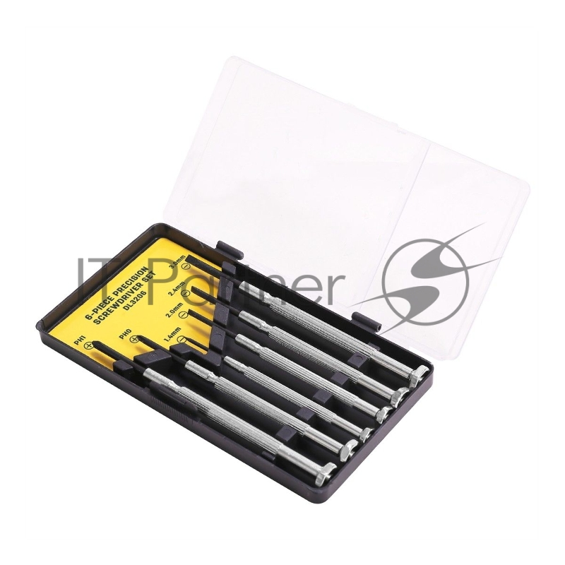 Набор прецизионных отверток Deli DL3206 6 шт Набор прецизионных отверток из 6 предметов: 2 шт. Philips: PH1, PH04 шт. Шлиц: 1,4 мм, 2,0 мм, 2,4 мм, 3,0 мм. Cr-V. Черная отделка.
