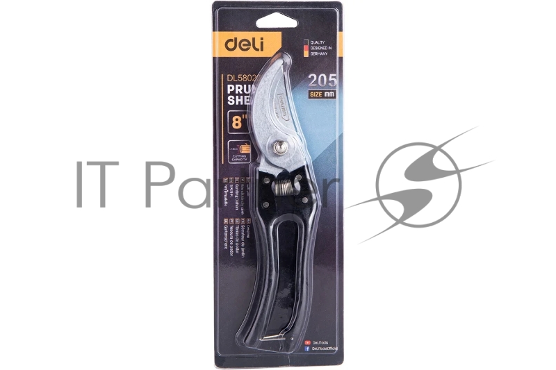 Секатор Deli DL580200 Размер 205 мм. Макс диаметр резки 14 мм. Сталь 65 MN. Ручка из ПВХ.