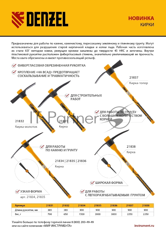 Кирка 1500 г, узкая, фиберглассовая обрезиненная рукоятка 900 мм// Denzel